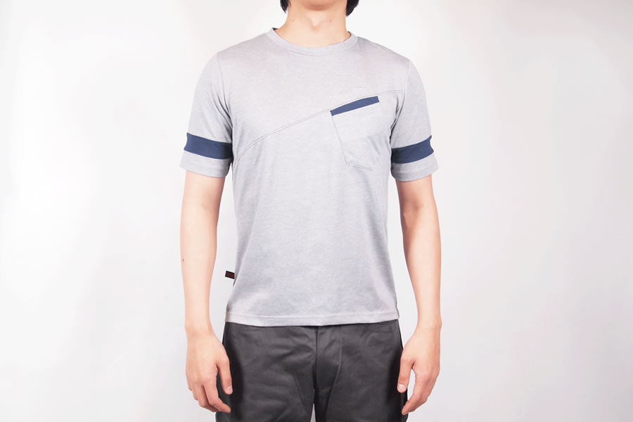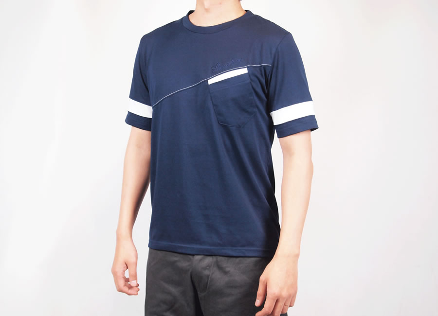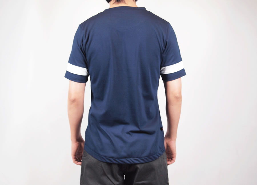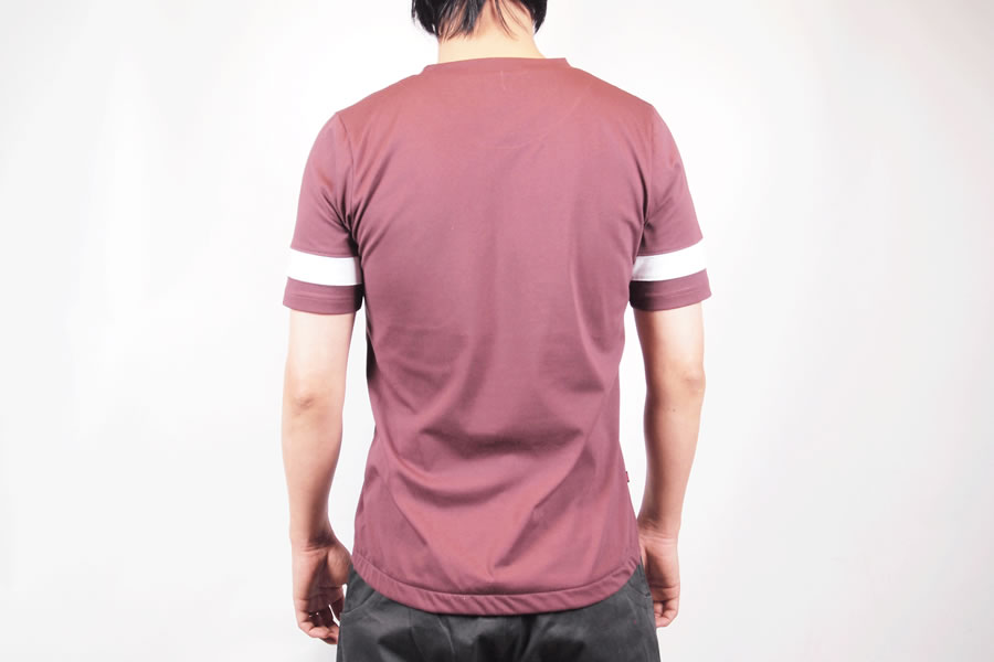 自転車乗車時の前傾姿勢の際背中の腰部分が開かないように背面部は少し長めつくられており、内側にシリコングリップ(シリコンテープ)の滑り止めを設け、また、左胸にはポケットも装備しております。